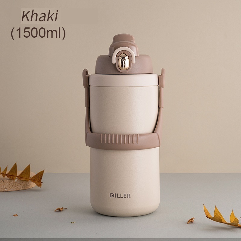 - 大容量水筒 ボトル スポーツボトル サーモフラスク ステンレス 真空断熱 1.5L 直飲み ハンドル付き 保温保冷 アウトドア ◆カーキ