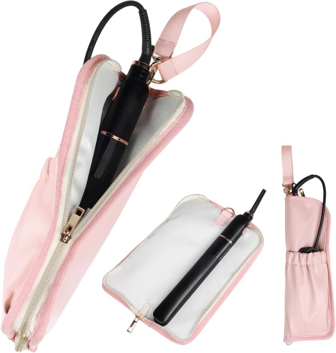 - ヘアアイロンケース 耐熱 収納ポーチ 吊り下げ 300℃熱いまま収納 180°全開可能 PUレザー 防水 上質 厚手 断熱