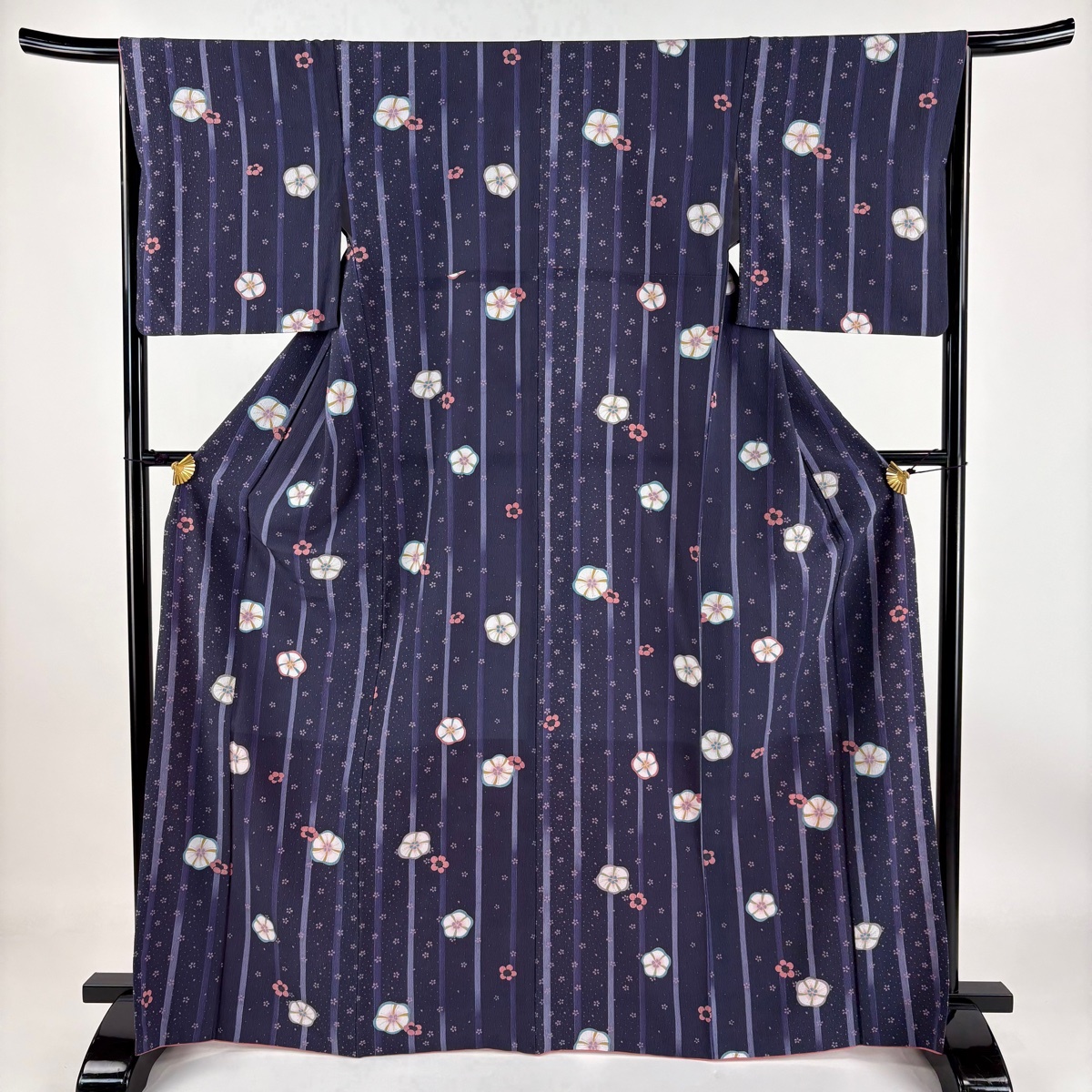 > 小紋 身丈167.5cm 裄丈66cm M 袷 洗える着物 梅 縦縞 濃紫 化繊 優品 【中古】