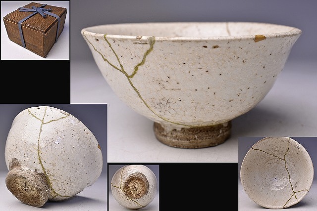 > 詳細不明 時代 古陶磁 ★ 白釉 茶碗 ★ 古箱 (難あり)★ 粉引の様な景色で直しあり ★ 李朝風の風情 ★ 茶道具 ★