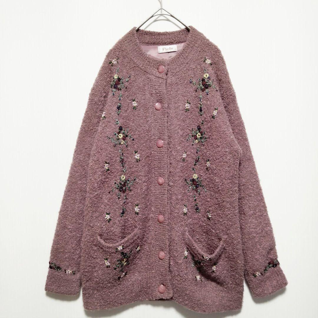 - 【大人気】モヘア混 花柄 刺 カーディガン 裏地あり くすみピンク 1
