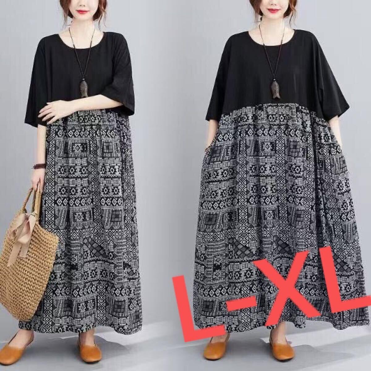 - ワンピース マキシワンピース レディース 春夏 切り替え ロングワンピースロング丈 半袖 綿麻風幾何柄 マキシ30代 40代 50代 LWGA104(L-XL)