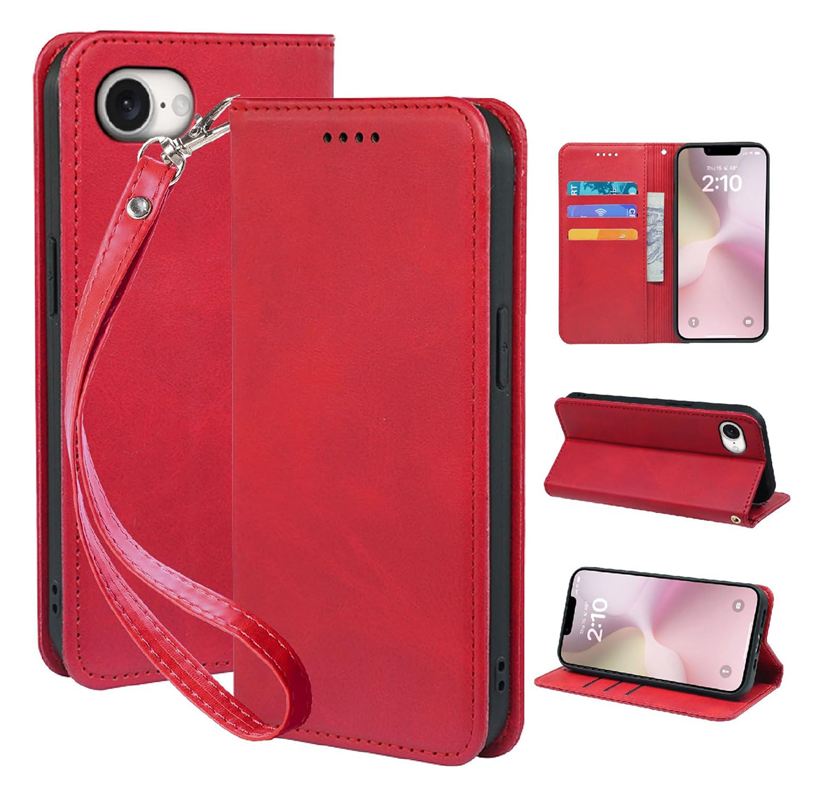 - iPhone 16e ケース 手帳型 スタンド機能付 360度保護 カード収納 PUレザー ベルトループ付きIPU レッド ay278