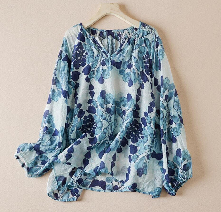 - プリント柄 チュニック カジュアル 長袖 ブラウス 大きいサイズ ゆったり トップス 涼しい きれいめ ブルー