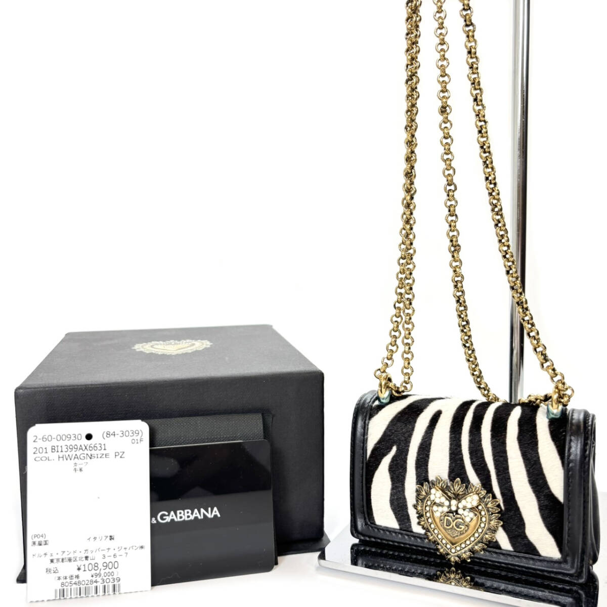 > 【新品同様】 DOLCE&GABBANA ドルチェ&ガッバーナ DEVOTION ナノ チェーンショルダーバッグ ゼブラ柄 レザー ブラック D&G