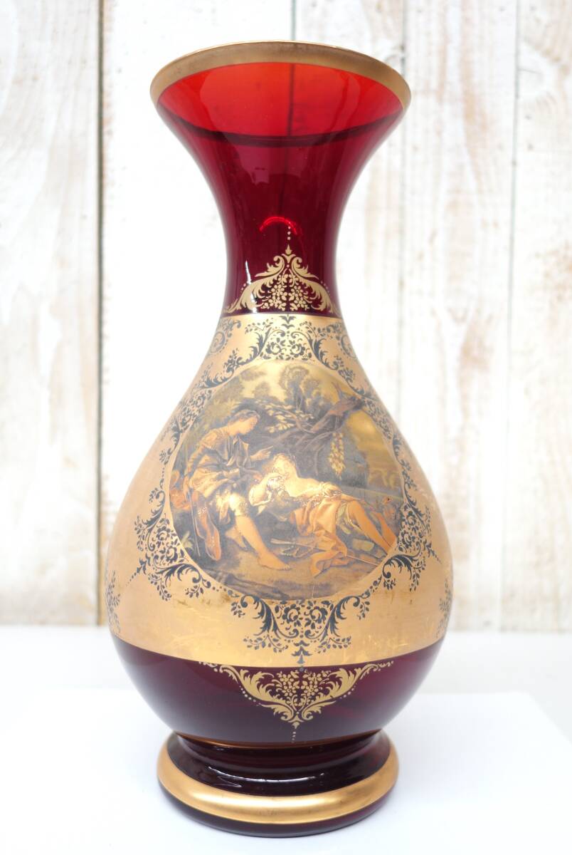 - レトロコレクション 工芸硝子 *ボヘミアングラス ベネチアングラス 硝子花器 フラワースタンド 花瓶 飾壺*赤色硝子 金彩