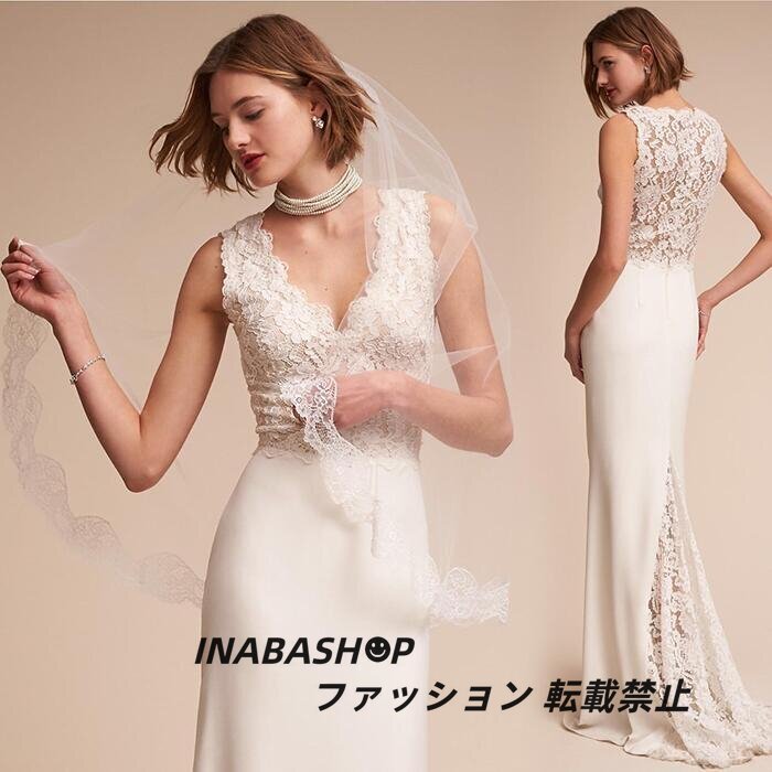 - ウェディングドレス マーメイド レース マーメイドドレス ボタン付き キャミソールドレス 上品 トレーン キャミソール ロングドレス 前撮り