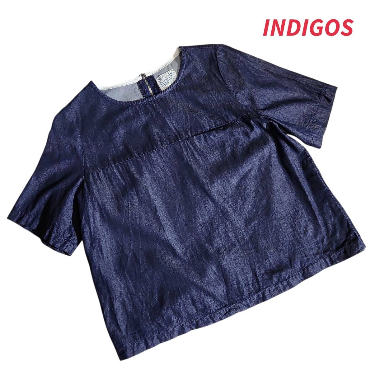 - INDIGOS ノーカラー・やや薄手・デニム風プルオーバー半袖トップス 濃紺ネイビー