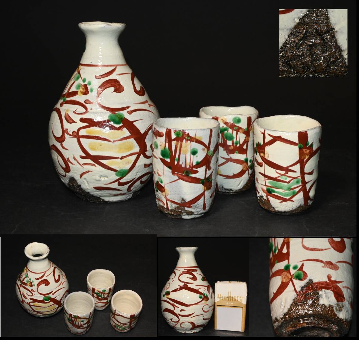 - 真贋保証■高内秀剛 作■ 赤絵酒器 徳利 ぐい呑三客 箱無 東京都生 酒注 酒次 酒杯 酒盃 益子焼