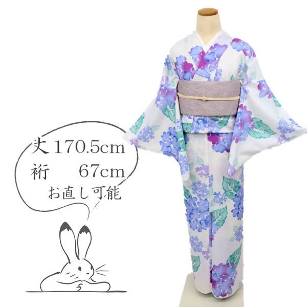- 【浴衣】 新品 洗える♪浴衣 長尺 あじさいの花模様 白 化繊 夏着物 US5-3