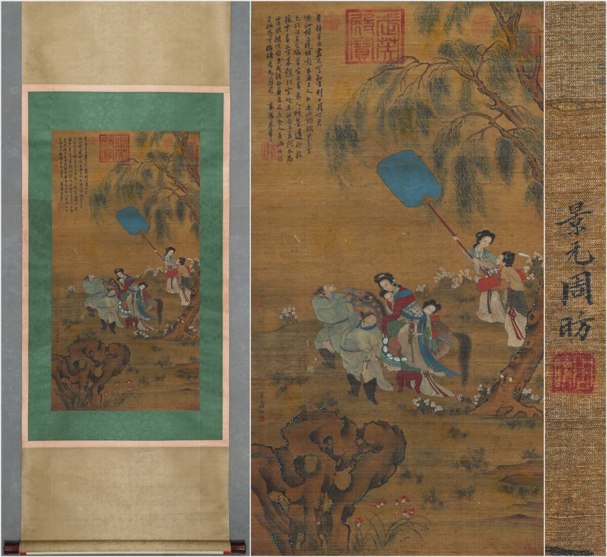 > 古美術 掛け軸 中国・唐時代 「周昉書」 絹本 【貴妃上馬図】 立軸 書道 巻き物 肉筆保証 唐物 古画 画心94x50cm LT-250877
