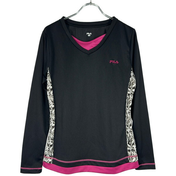 > 古着 レディースM FILA/フィラ プラクティスシャツ 長袖 グラフィック スポーツウェア ブラック/ピンク/花柄 FL5251