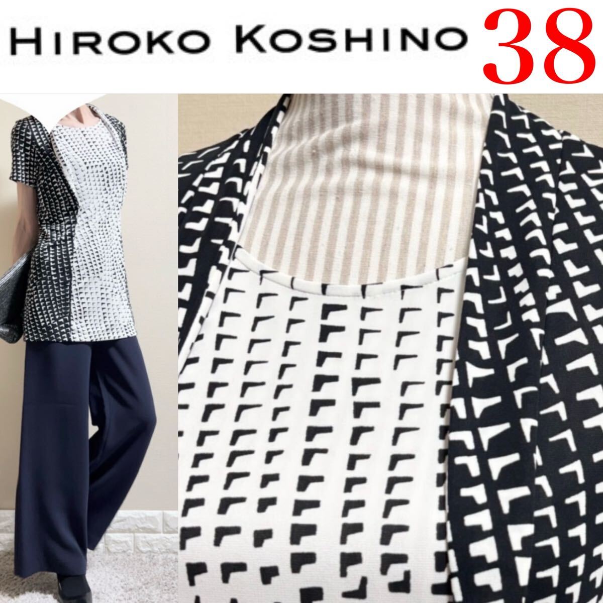 > 美品!ヒロココシノ HIROKO KOSHINO 定価38,000円 ジオメトリック 配色 チュニック 38 M モノトーン 日本製 洗える