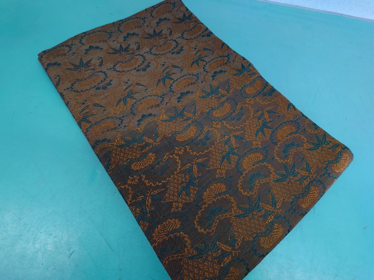 > ●117 全通 茶色 ディープ グリーン/ブラウン 光沢 糸 刺繍 松 竹 豪華 高級 六通 袋帯 縁起物 ③