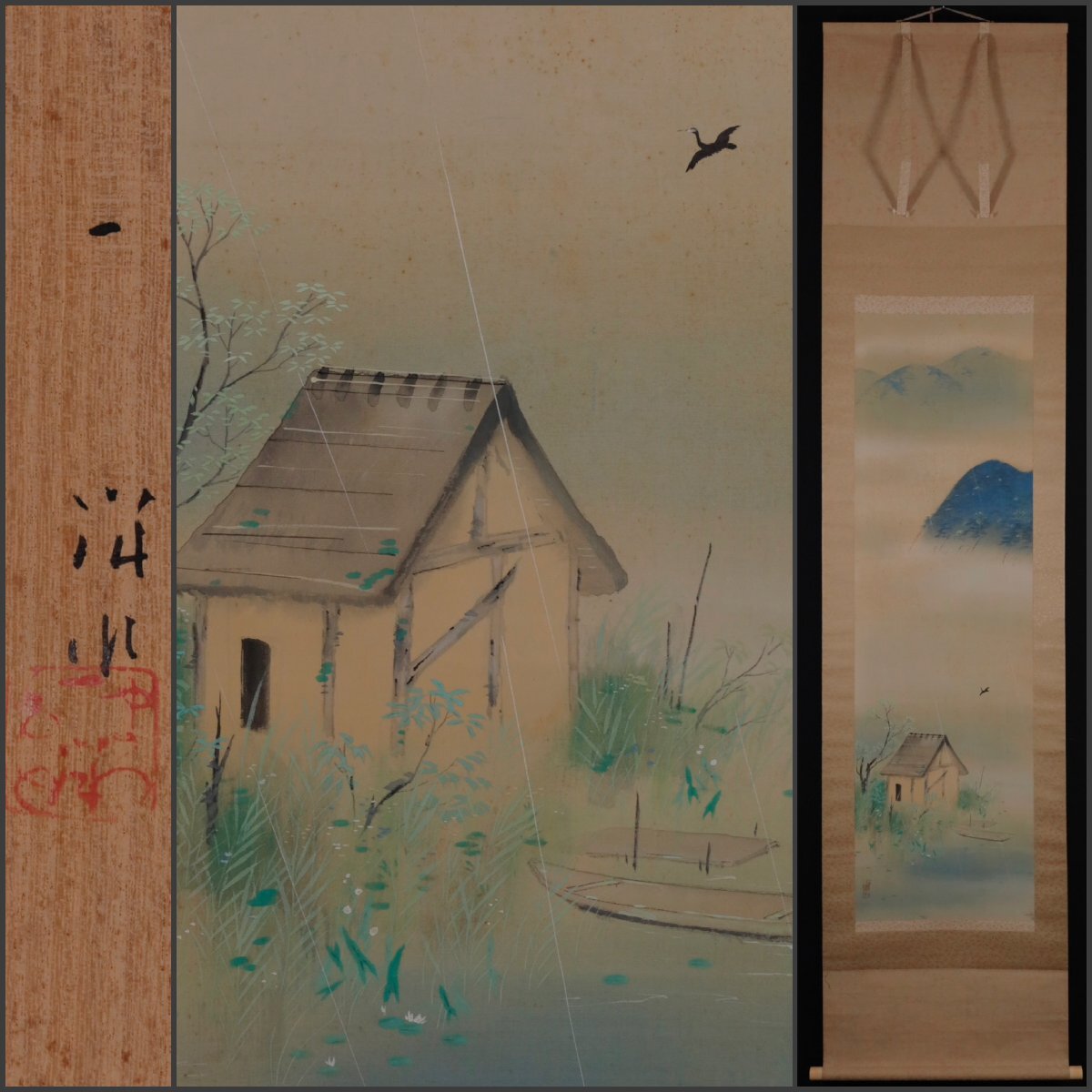 > 【模写】吉】12820 松本一洋 白雨 山水図 共箱 二重箱 山元春挙 川村曼舟師事 物語絵 歴史風俗画 大和絵 茶掛け 茶道具 掛軸 掛け軸 骨董品