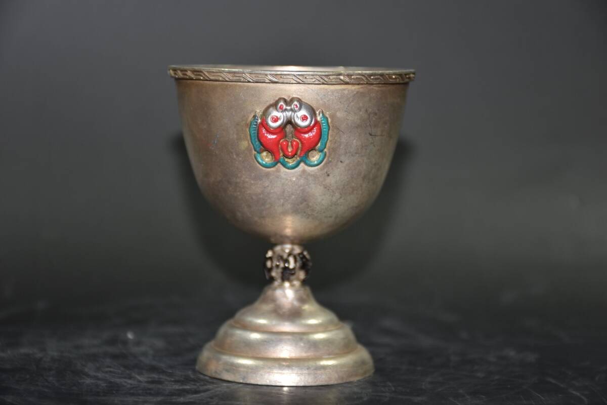 - 【超珍館蔵】白銅製 景泰藍 琺瑯彩 年年有餘酒杯 置物 賞物 古賞物 古董品 古美術品 時代物 旧家蔵出 稀少珍蔵品