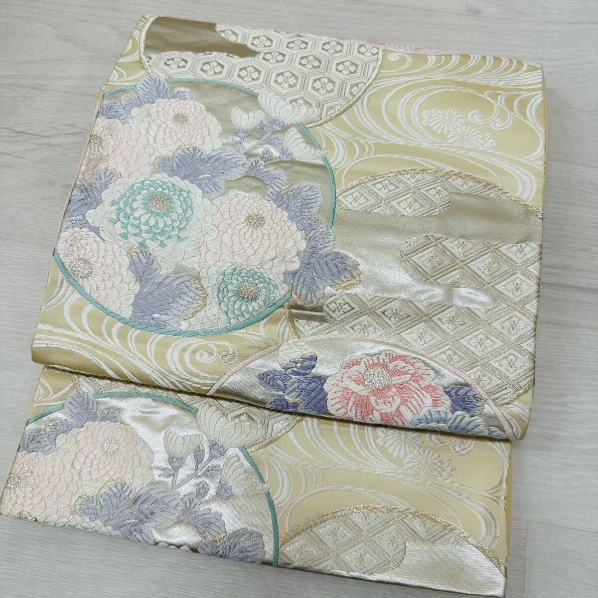 > 袋帯 唐織 丸に美しい花模様 流水模様 正絹 着物 W-3823