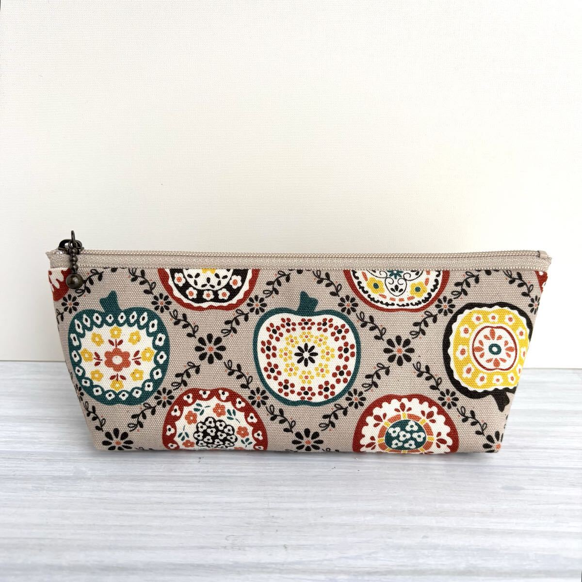 - りんご フラワー ペンケース 筆箱 筆入れ マチあり ハンドメイド 文具 レトロ 北欧風 ベージュ