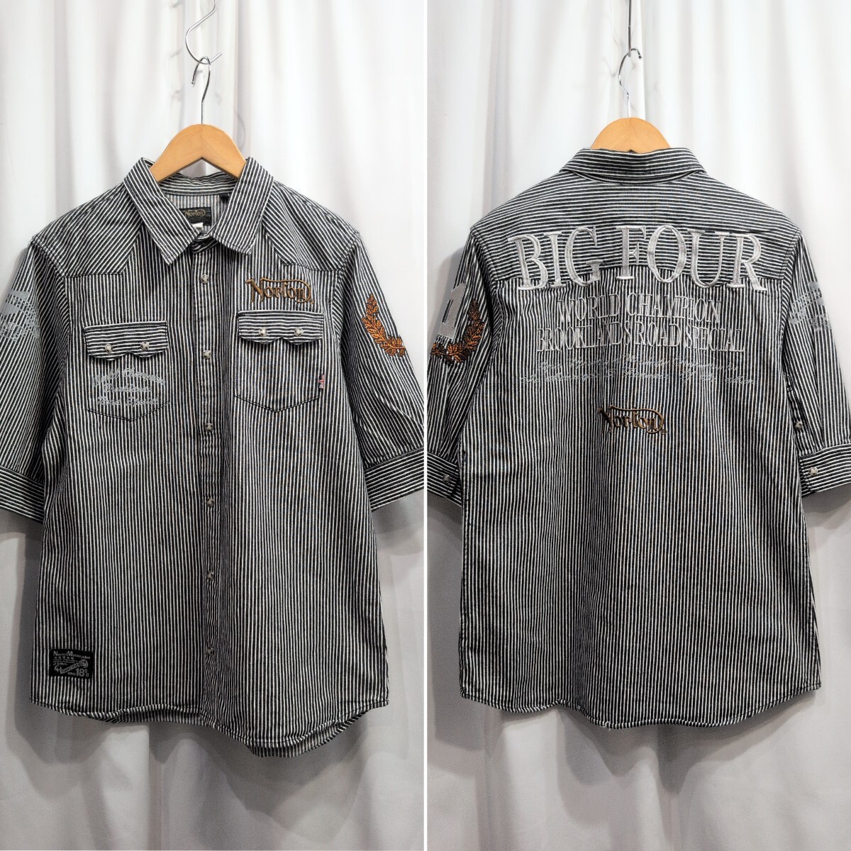- NORTON ノートン 刺繍 ヒッコリー ストライプ 5分袖 ウエスタンシャツ L モーターサイクル デニムシャツ ワークシャツ/ショット/バンソン
