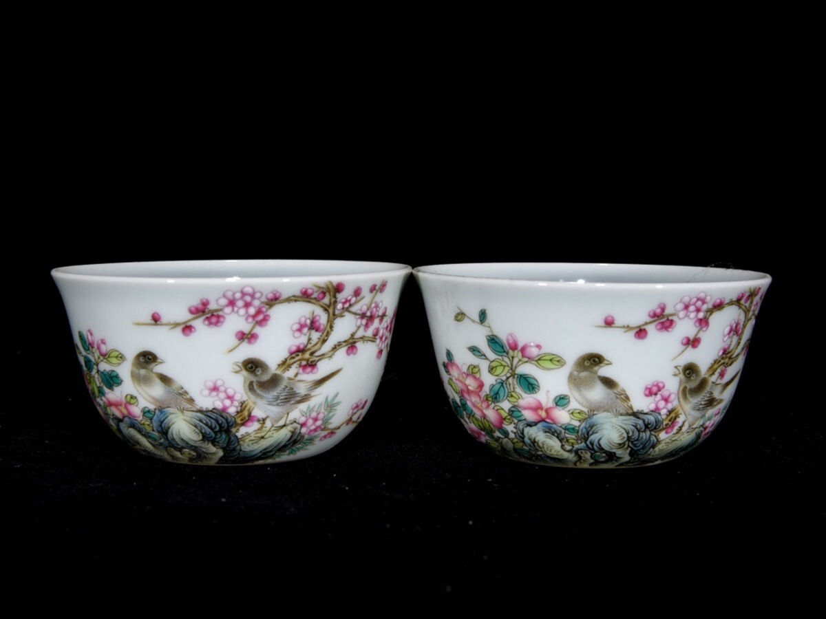 - 「清 雍正年製 陶磁器 琺瑯彩花鳥紋 杯一対」染付 置物 擺件 古賞物 中国古美術 旧蔵出