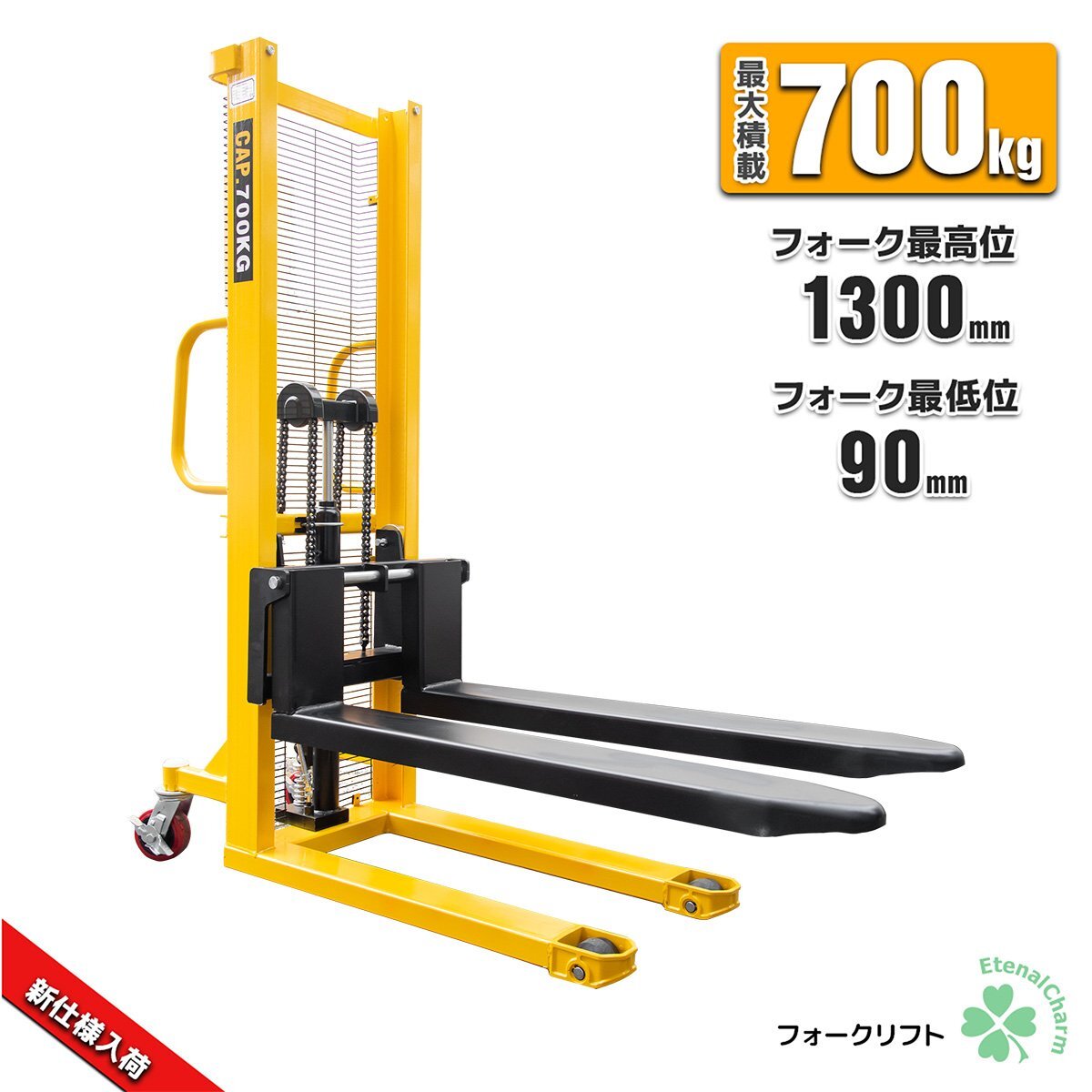 > 【営業所留め】ハンドフォークリフト 手動油圧式スタッカー 最大積載700kg ダブルチェーン 爪幅調整式 幅320~550mm 台車