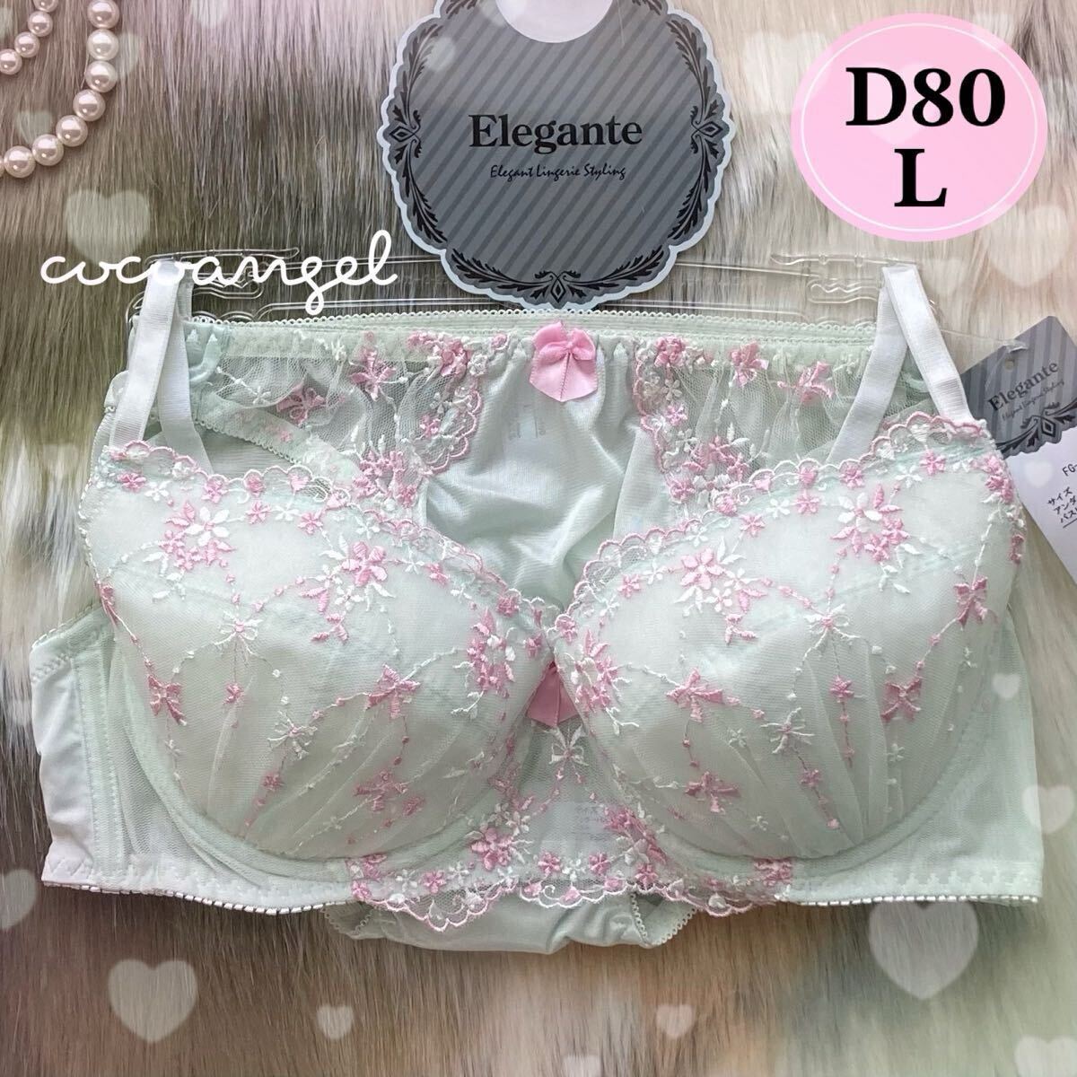 > 【D80-L グリーン 上下】新品 ブラ&ショーツ ブラジャーショーツ パッド付き かわいいブラ 刺しゅう 透けパンティ 女装 男性ブラ Dカップ