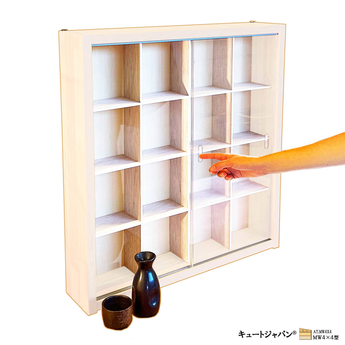 > ★値下げ★和食器 焼物 陶器 陶芸 骨董 徳利 お猪口 コレクション 収納ケース 16マス アクリル障子付 ホワイト色塗装 日本製