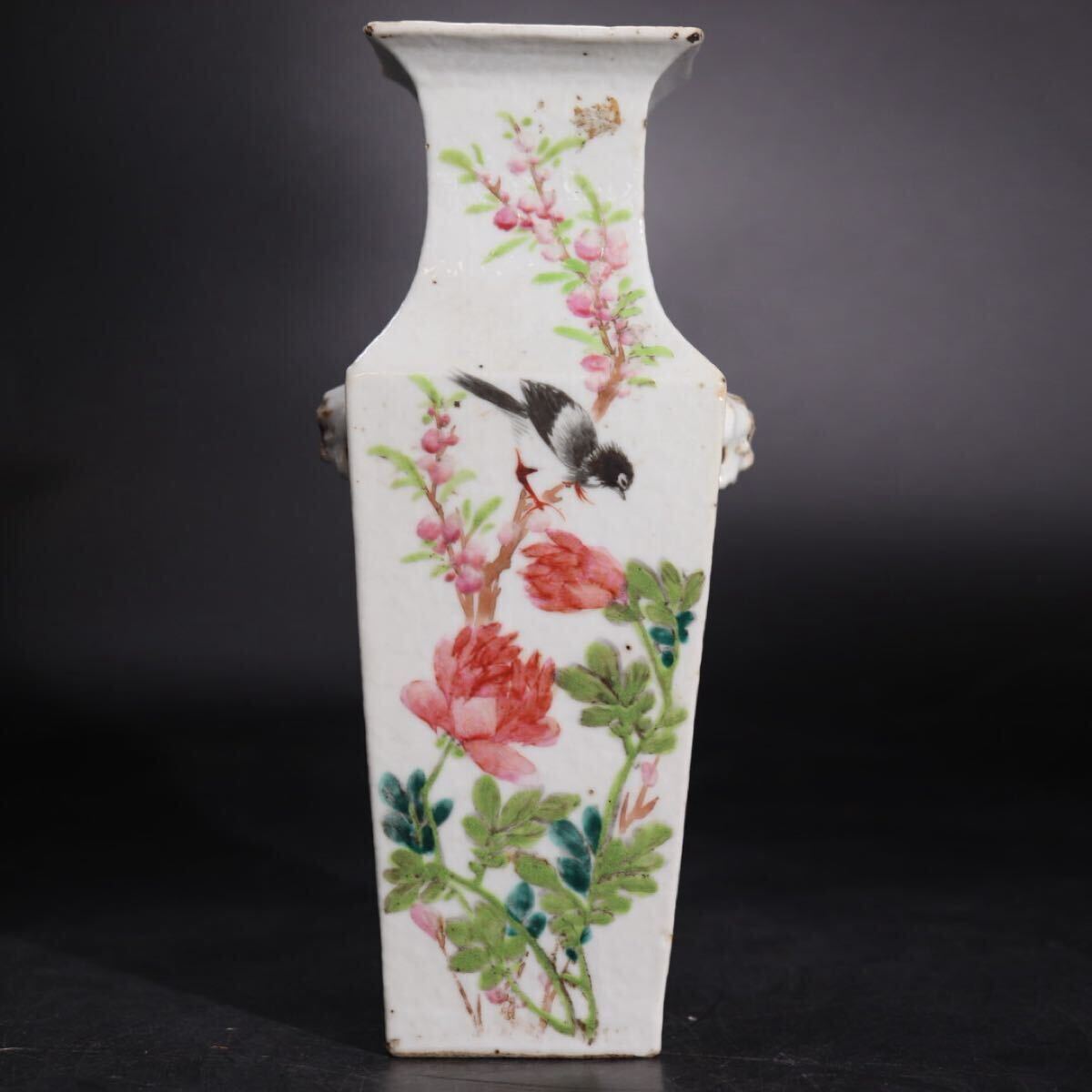 - 時代 色絵 墨彩 花鳥 ・ 漢詩紋 花瓶 / 中国美術 花器 壺 煎茶飾 .G2400