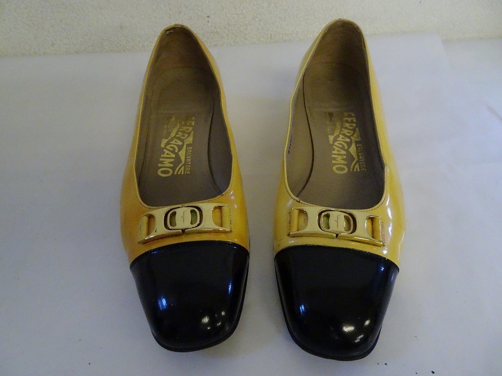 - BDH8★フェラガモ/Ferragamo 靴 フラットシューズ ヴァラ リボン レザー 革 ゴールド金具 黄/黒 バイカラー サイズ5 1/2 D 23.0cm