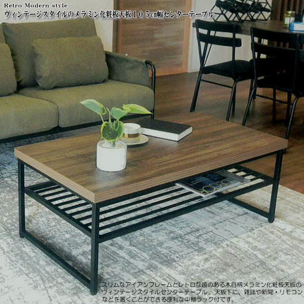 > ヴィンテージスタイルのメラミン化粧板天板105cm幅中棚付センターテーブル 木製 スチール シンプル レトロ ブラウン ブラック 2人~3人用