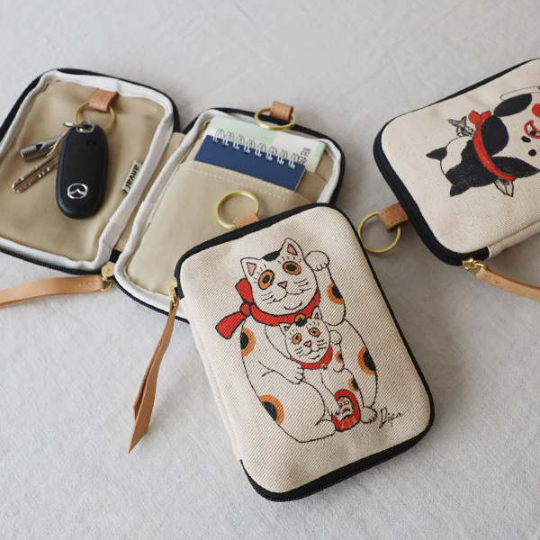 - 芸術の秋SALE Mサイズ 手描きART クッション 生成りデニム キーケース 通帳ケース 招き猫 マルチポーチ フラグメントS03A