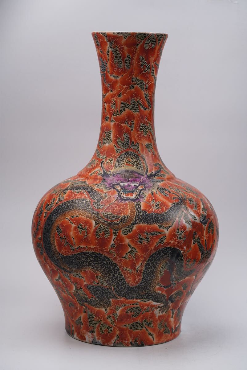- 【竹華】中国古美術 清時代 紅描金 粉彩 色絵 琺瑯彩 龍紋 花瓶 大魄力 骨董品 古玩 骨董 時代物 当時物 唐物 古置物 乾隆年製 pe66