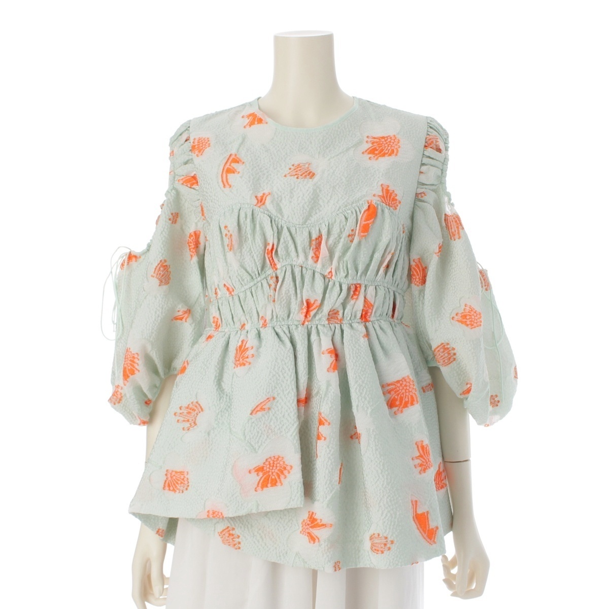 - セシリーバンセン 22SS FENTON TOP シルク混 ジャガード ギャザー パフスリーブ ブラウス ミントグリーン UK8 US4【中古】
