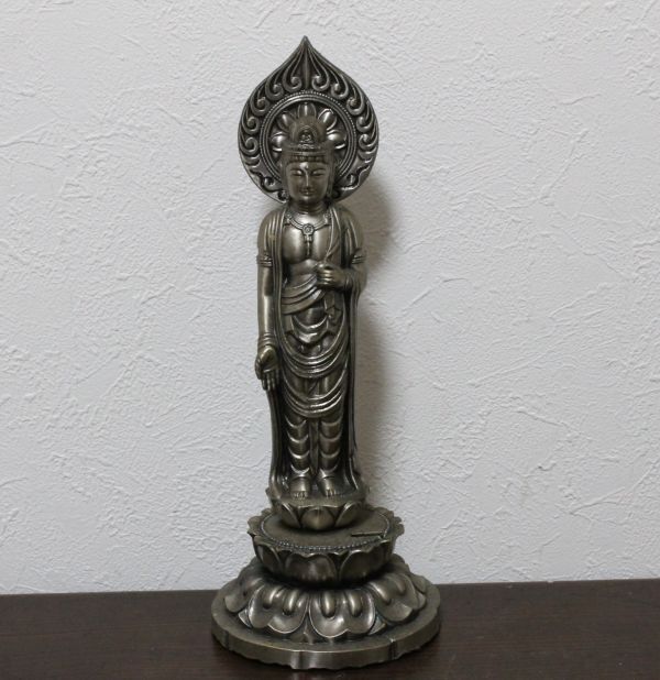 - 仏具屋さんからの買取品 金属製の綺麗な銀色の観音菩薩像 ブロンズ 銅仏像 n321