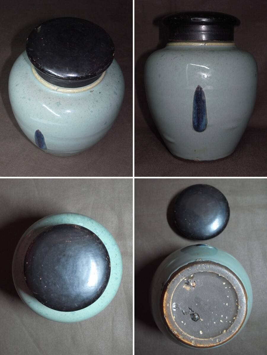 - 【青磁釉茶壺】葉茶壺 蓋付き / 時代物 骨董 茶壷 大壷 小壷 抹茶 茶道具 抹茶 茶器 中国 煎茶青磁釉 茶壷 茶入れ
