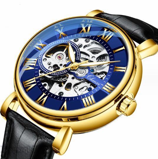 - 男性腕時計 新品 アナログ 機械式自動巻 3針 スケルトン 文字盤 メンズ ウォッチ 夜光表示 防水3ATM 本革ベルト 紳士 通勤 2色選ぶ/青