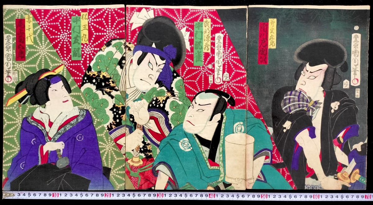 > 明治期/真作 豊原国周「松王丸 斧定九郎」本物浮世絵木版画 歌舞伎絵 役者絵 芝居絵 錦絵 大判 三枚続き 裏打ち