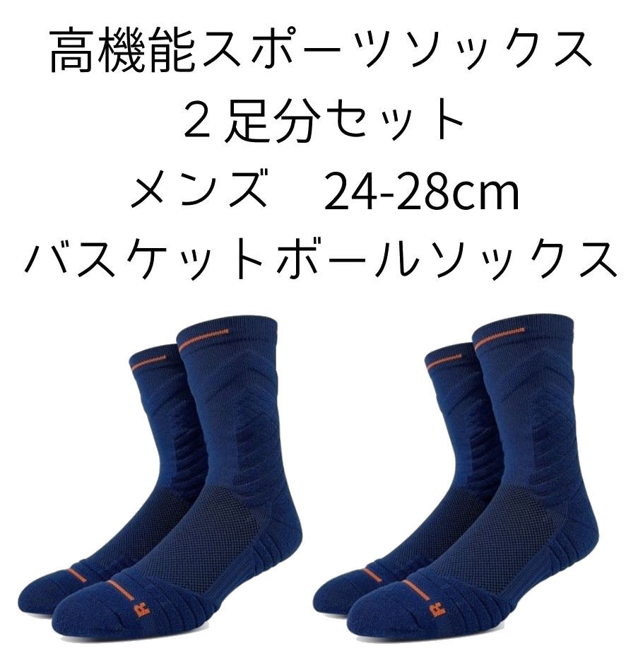 - 【ネイビーブルー 2足分セット スポーツソックス】バスケットボール サッカー 高機能スポーツソックス 靴下 分厚くて丈夫 足への負担を軽減