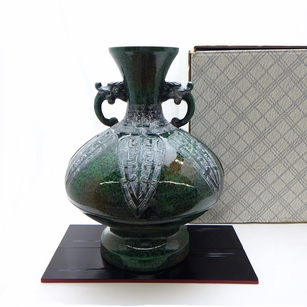 - SI-124【未使用】高岡銅器 耳つき花瓶 花器 花生 特殊合金 箱・台座つき アンティークショップ保管品 デッドストック