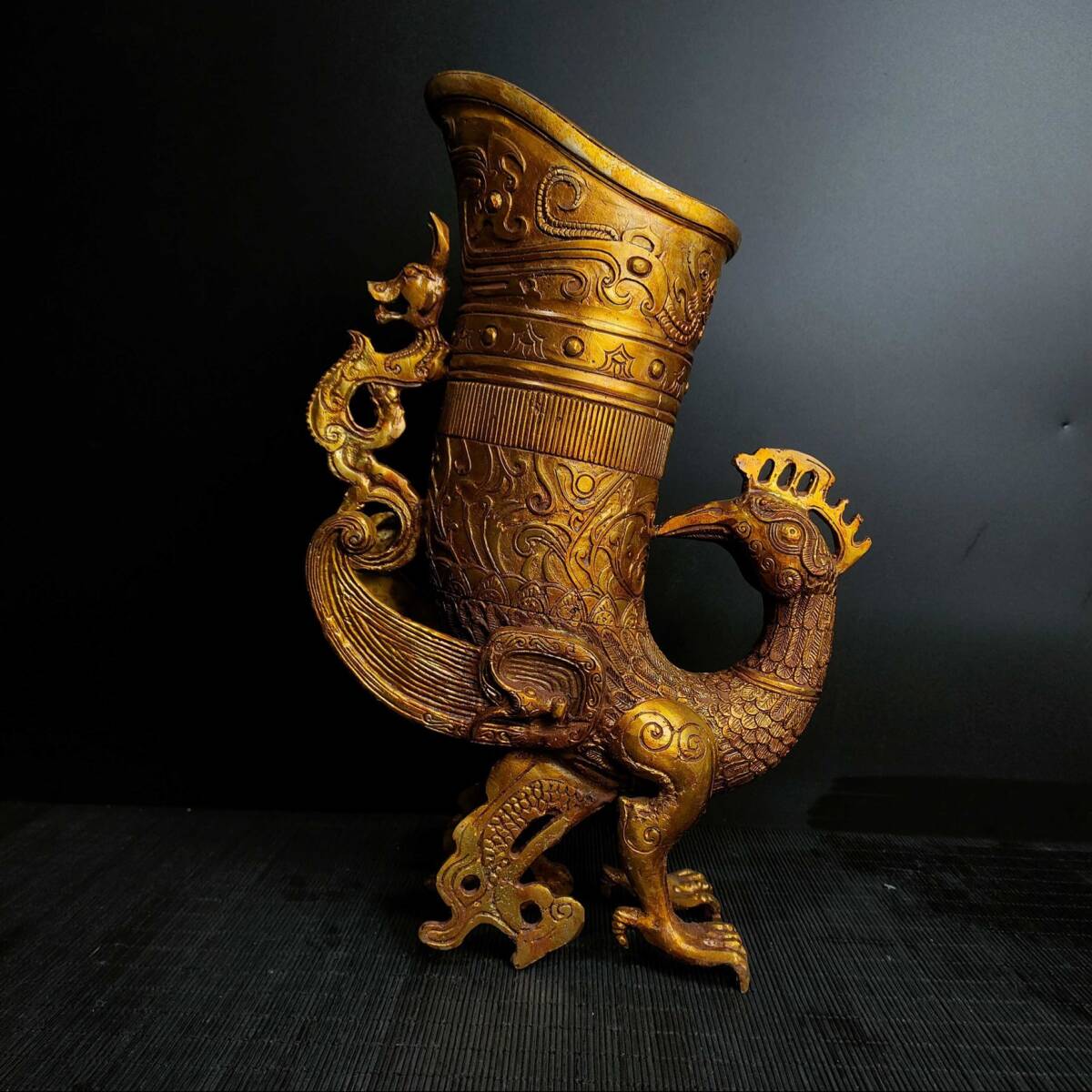 - 蔵友旧蔵出 戦国 青銅作 塗金 鳳鳥杯 希少珍品 貴重品 置物 古賞物 中国古玩 中国古美術品 館蔵品