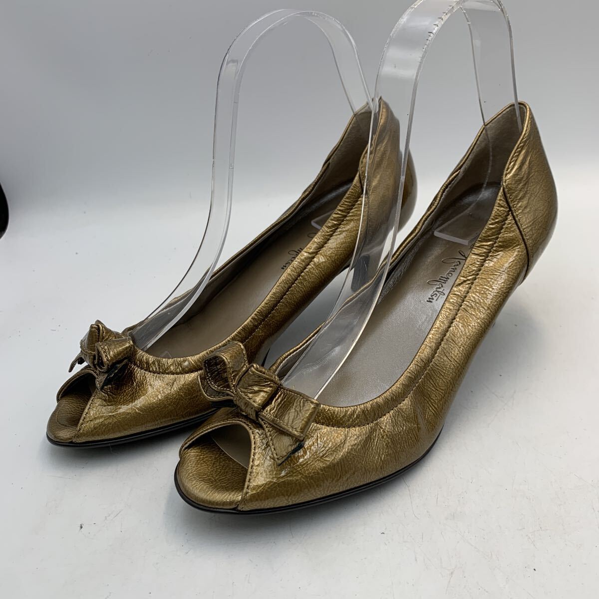 > T863 美品 GINZA Kanematsu 銀座カネマツ レディース オープントゥパンプス 24cm ゴールド エナメル リボン