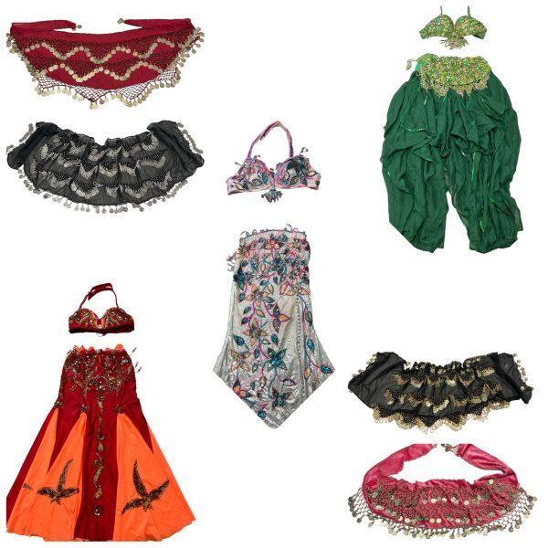 - 【お得おまとめジャンクセット】ベリーダンス 衣装 セットアップ 3着 腰巻き4枚 GUZEL COSTUME インド ビーズ スパンコール