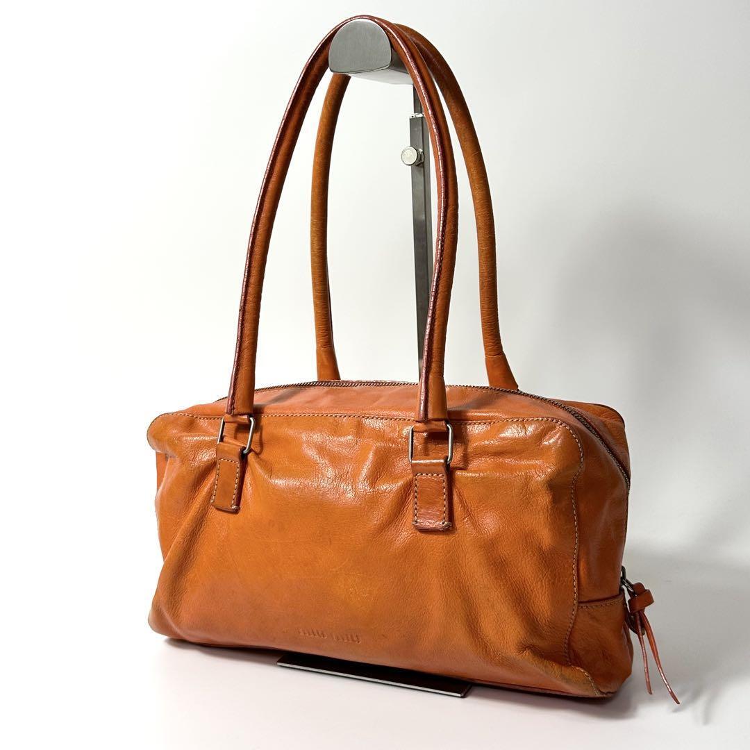 - MIUMIU レザー オレンジ ミニボストンバッグ エンボスロゴ