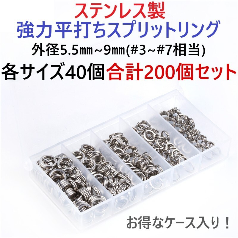 > 【送料無料】ステンレス製 強力平打ちスプリットリングセット #3~#7 各サイズ40個合計200個セット ケース付き