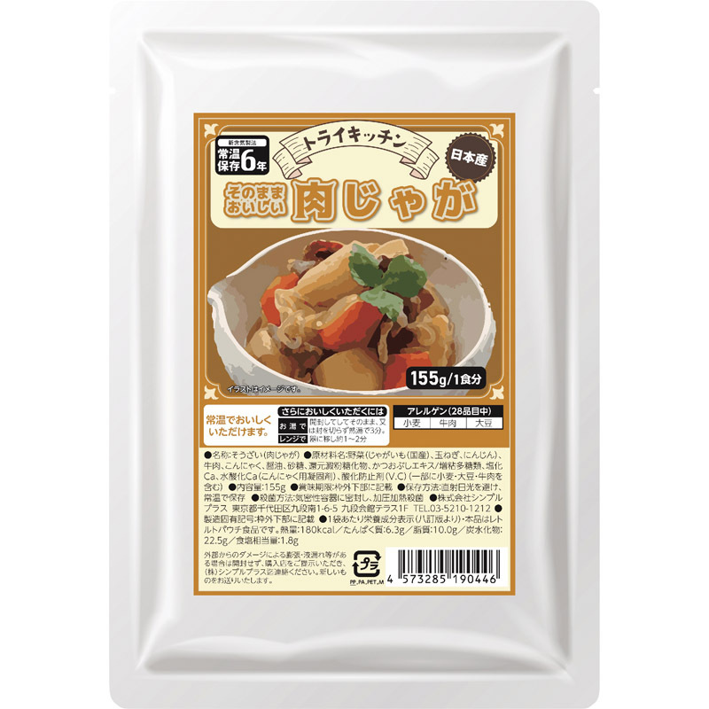 〇注意事項・送料800円が販売価格に含まれています・お取り寄せ商品です。弊社にて手配後、メーカー・卸業者からの直送になります。・まれにメーカー欠品、出荷遅延等が発生致します。問題発生時は別途メールにてご連絡致します。・配送方法の指定、日時指定、置き配、ギフト対応、他商品との同梱配送などは対応できません。・まとめ買いや複数購入の場合は通常より発送に時間が掛かる場合がございます・複数個口の場合、2階以上への搬入ができない場合があります。(その場合は1階での受け渡しとなります)・大型連休、お盆、年末年始などは発送をお休みさせていただく場合がございます・メーカー都合により、パッケージは予告なく変更される場合がございます・梱包用のダンボールはリサイクル品を使用させていただきます。・注文に関するご連絡(注文確定通知・発送通知など)はメールでご案内させていただきます※商品ページの内容について、少しでもご不明な点などがございましたら購入前に一度ご連絡ください〇商品説明あらゆるギフトシーンにおすすめです!そのままで常温で食べられるおいしい非常食。〇商品仕様●内容:トライキッチン 肉じゃが 155g TRY-11規格●裸商品(140×5×200mm) 161g●加工地:日本●賞味期限:製造日より常温にて2190日●アレルギー表示:小麦(出典:株式会社 八大)