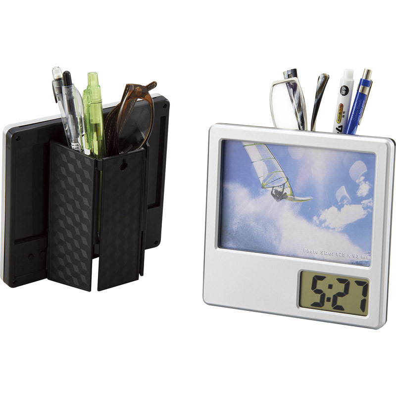 〇注意事項・送料800円が販売価格に含まれています・お取り寄せ商品です。弊社にて手配後、メーカー・卸業者からの直送になります。・まれにメーカー欠品、出荷遅延等が発生致します。問題発生時は別途メールにてご連絡致します。・配送方法の指定、日時指定、置き配、ギフト対応、他商品との同梱配送などは対応できません。・まとめ買いや複数購入の場合は通常より発送に時間が掛かる場合がございます・複数個口の場合、2階以上への搬入ができない場合があります。(その場合は1階での受け渡しとなります)・大型連休、お盆、年末年始などは発送をお休みさせていただく場合がございます・メーカー都合により、パッケージは予告なく変更される場合がございます・梱包用のダンボールはリサイクル品を使用させていただきます。・注文に関するご連絡(注文確定通知・発送通知など)はメールでご案内させていただきます※商品ページの内容について、少しでもご不明な点などがございましたら購入前に一度ご連絡ください〇商品説明あらゆるギフトシーンにおすすめです!123×95mmの写真が入れられる時計付ペンスタンドです。背面のペンスタンドは折りたたみ可能で、壁掛けとしても使えます。・時計(置掛兼用)、カレンダー、フォトフレーム、ペンスタンド〇商品仕様●内容:63×142×139mm規格●化粧箱入(153×148×28mm) 230g 単4電池1個使用(別売)●材質:ABS樹脂●加工地:中国(出典:株式会社 八大)
