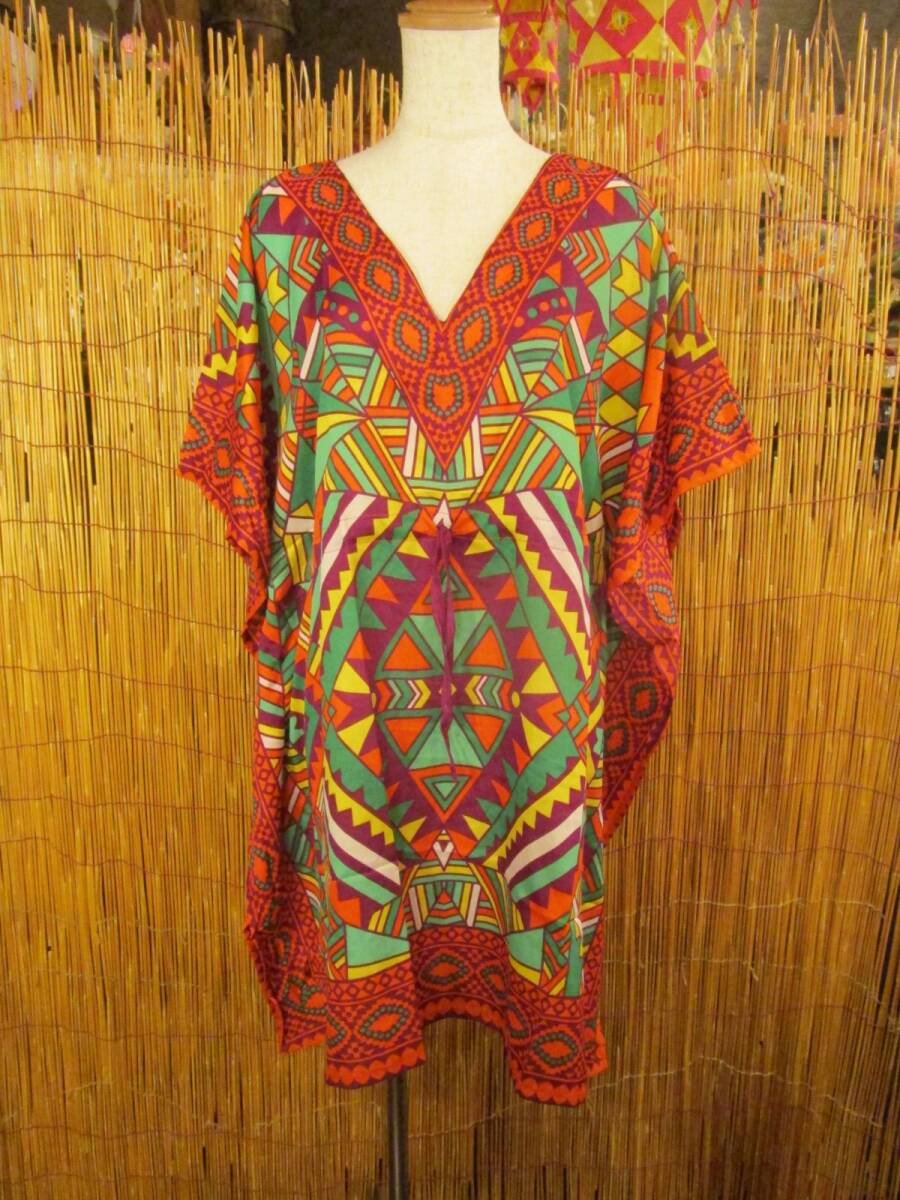 > ⑤新品*薄手ビスコース素材*ゆったりサイズ *レトロ調プリント*ガラベーヤ*ポンチョ風*ミドル丈*ワンピース*ベリーダンス
