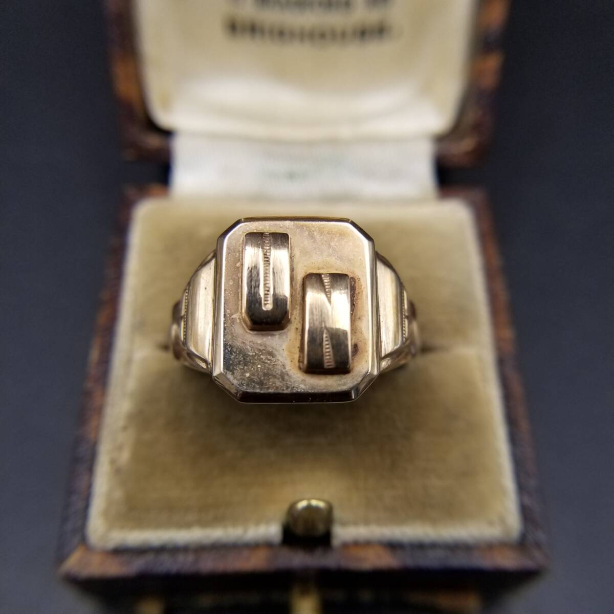 - 20's イニシャルレター UN アールデコ 米国 ヴィンテージ シグネット リング K10 イエローゴールド 金 指輪 レトロ Y24-K③