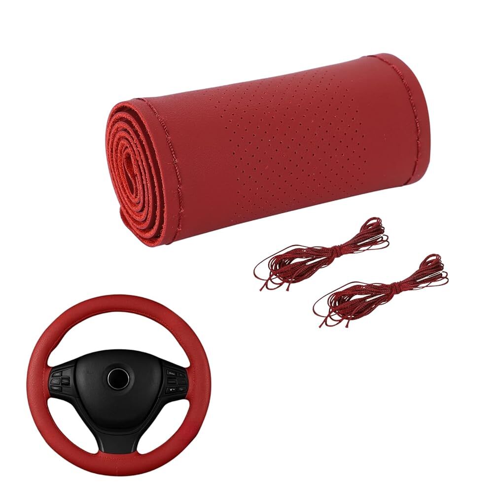 - ハンドルカバー ステアリングカバー 本革 編み込み 取付簡単 幅10.5cm 車 滑りにくい ぴったり ワインレッド×レッド糸