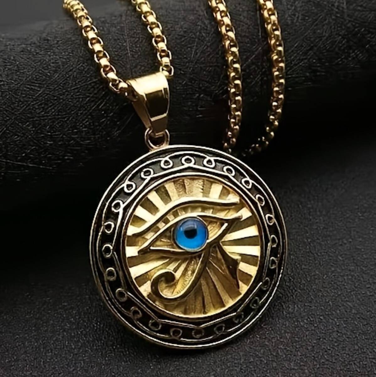- ネックレス ホルスの目 古代エジプト 5cm ゴールド 丸型 メンズ アクセサリー 大きい 金属 ステンレス おしゃれ 男性用 目立つ t8370